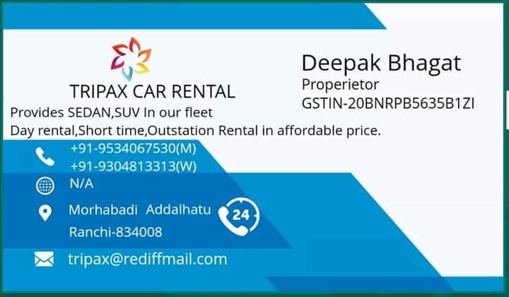 Deepak Bhagat, a proud member of the Oraon community, offers reliable and affordable car rental services in Ranchi. Specializing in day bookings and short-time rentals (4-5 hours), Deepak provides special discounts for short-time bookings. His fleet includes Tata Zest, Sumo Victa, and Hyundai Accent, ensuring a comfortable travel experience. He also caters to outstation bookings for destinations like Gumla, Lohardaga, Simdega, Chaibasa, Daltonganj, and nearby states. For bookings or estimates, contact Deepak at ☎️ +91 9534067530 (Mobile) or ☎️ +91 9304813313 (WhatsApp). Give him a chance to serve you for a seamless and enjoyable journey! �✨