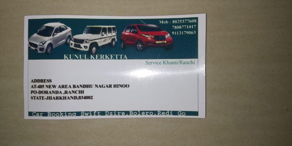 Kunul Kerketta, a proud member of the Munda Tribe from Khunti, Ranchi, offers reliable and affordable car rental services in Ranchi and Khunti. Specializing in both local and outstation trips, Kunul provides a variety of vehicles, including Swift Dezire, Bolero, Ford Aspire, Tata Zest, Savari, and more. Whether it’s a round trip or a one-way journey, his services are tailored to meet your travel needs at budget-friendly prices. For bookings or inquiries, feel free to contact or WhatsApp Kunul at ☎️ 8825377608 or ☎️ 9905089437. Let him take care of your travel plans while you enjoy a comfortable ride! 🚗✨